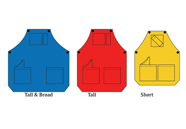 Because our friends have diverse bodies we have developed our aprons in a range of sizes (Small, Tall, Tall & Broad), each with pocket configurations for left and right-handed people.